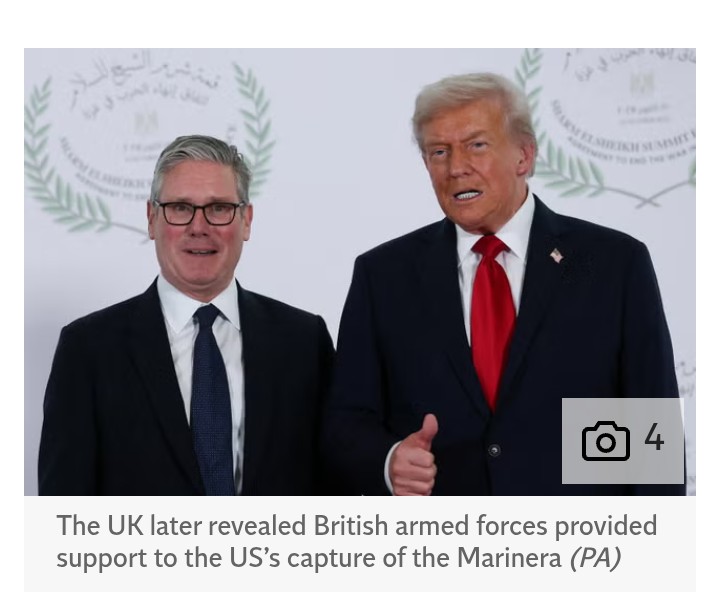 The vessel, Marinera, was intercepted by US forces with logistical and surveillance support from the British military, according to the UK Ministry of Defence. British involvement included RAF surveillance aircraft and the Royal Fleet Auxiliary ship RFA Tideforce. UK officials said the operation complied fully with international law.