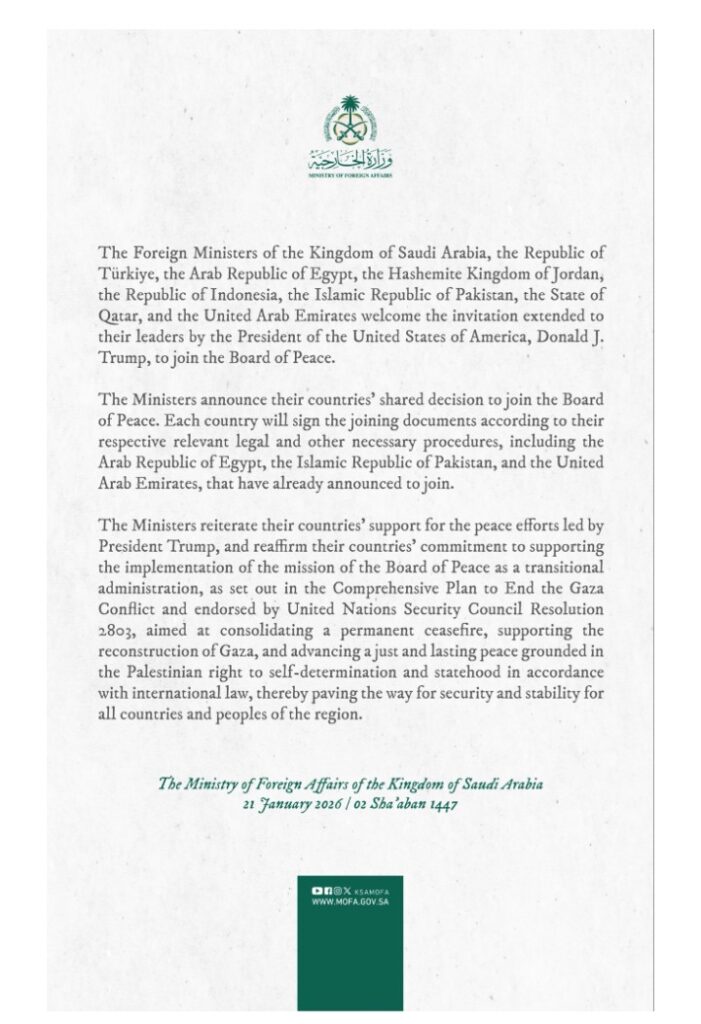 Saudi Arabia and seven other countries have agreed to join a proposed Board of Peace on Gaza following an invitation from United States President Donald J. Trump, according to a joint statement issued by their foreign ministers.