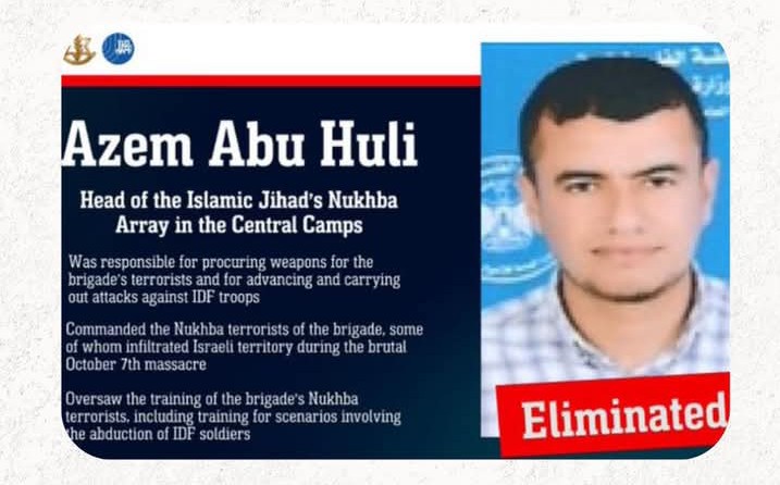The IDF also confirmed the killing of Azem Abu Huli, identified as the head of the Nukhba Array in the Central Camps sector of the Palestinian Islamic Jihad. According to Israeli authorities, Abu Huli was responsible for weapons procurement and overseeing training activities.