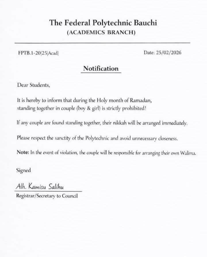 The management of the Federal Polytechnic, Bauchi has sparked widespread controversy after issuing a directive prohibiting male and female students from “standing together in couples” on campus during the holy month of Ramadan.