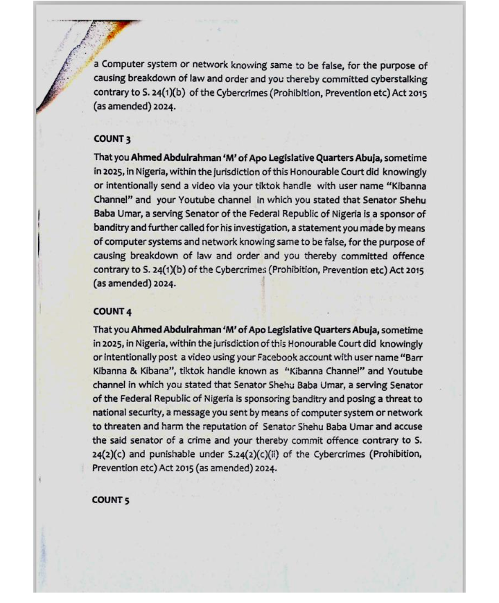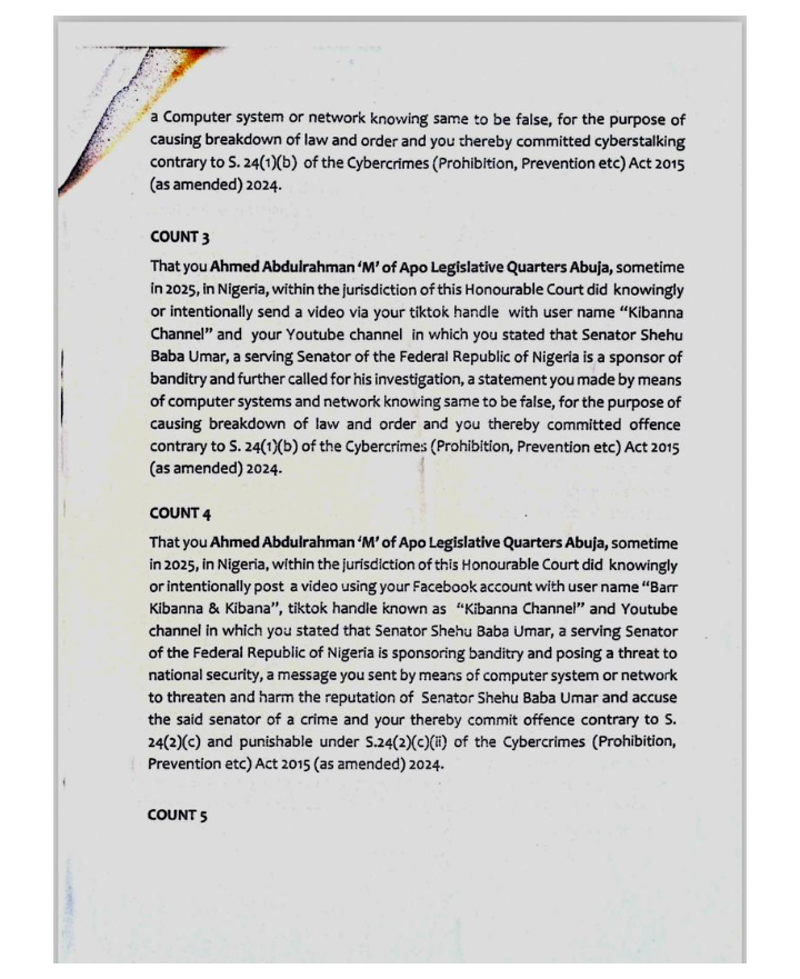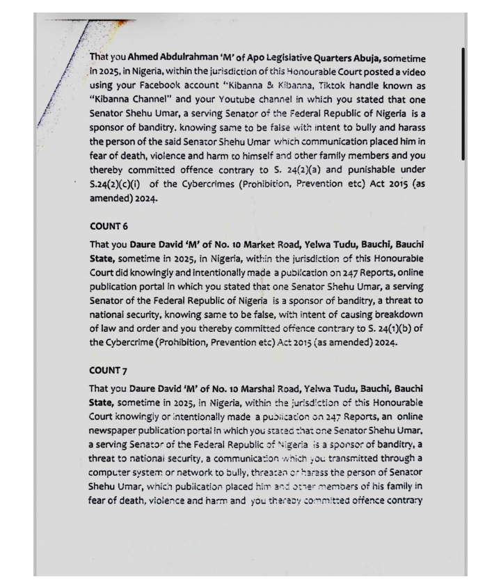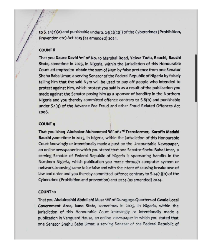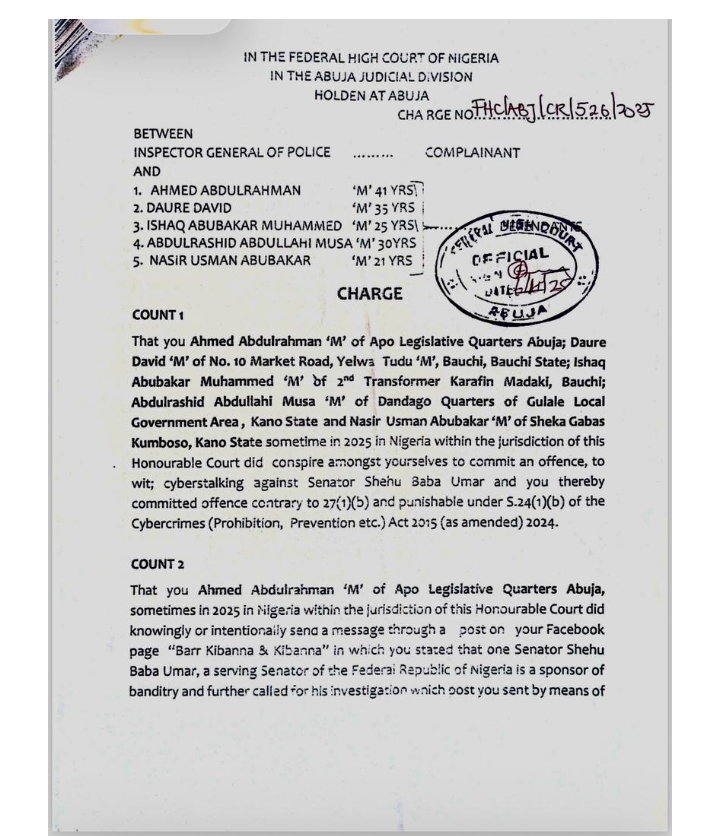 The Nigeria Police Force filed an 11-count criminal charge against the defendants, who include Ahmed Abdulrahman (41), Daure David (35), Ishaq Abubakar Muhammed (25), Abdulrashid Abdullahi Musa (30), and Nasir Usman Abubakar (21). They are accused of conspiring to commit cyberstalking against Senator Buba, contrary to Section 27(1)(b) and punishable under Section 24(1)(b) of the Cybercrimes (Prohibition, Prevention, etc.) Act, 2015 (as amended 2024).