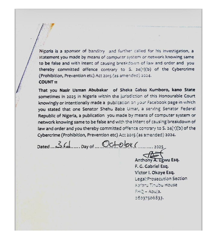 The charges were signed on October 3, 2025, by Anthony A. Egwu, F.G. Gabriel, and Victor I. Okoye of the Legal/Prosecution Section, Force Headquarters, Abuja.